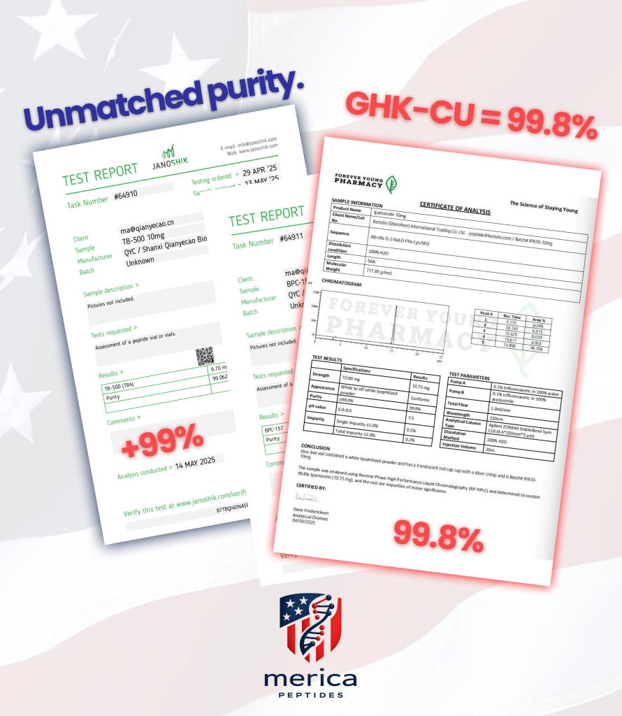 Merica Peptides delivers the highest-quality research peptides, all tested by third parties to ensure over 99% purity. We focus on providing reliable, consistent compounds so researchers can concentrate on what matters most.